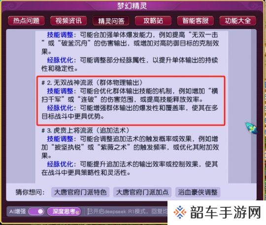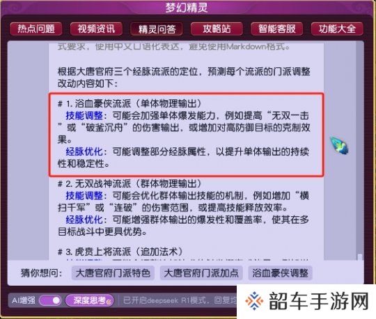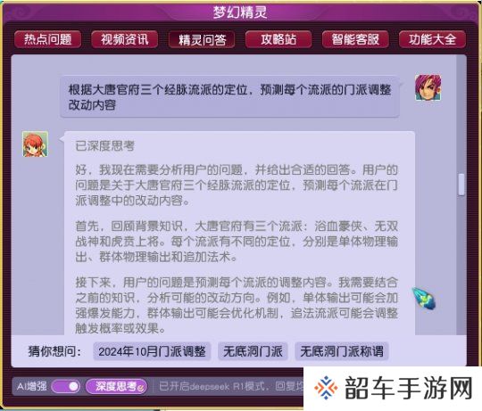 在本周二维护后,梦幻精灵-AI增强”功能接入“DeepSeek-R1”模型已在全部服务器放出。正巧四月门派大改将近,今天我们就用新版梦幻精灵来预测一下,全梦幻话题度最高的门派“大唐官府”,会在门派调整中有怎样的改动吧!