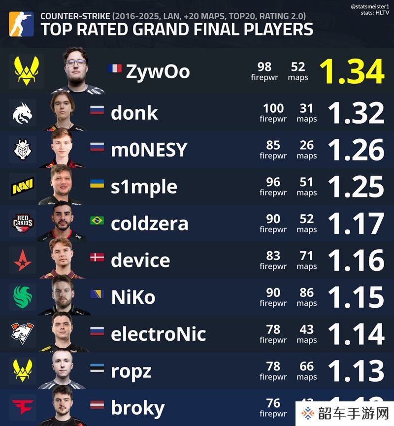 statsmeister整理数据:ZywOo、donk和m0NESY是决赛型选手