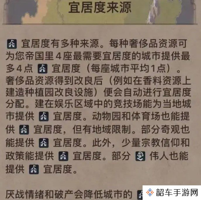 宜居度有多种来源。每种奢侈品资源可为您帝国里4座最需要宜居度的城市提供最多4点宜居度(每座城市平均1点)