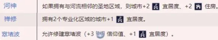 不同的宗教选择会对我们的文明产生不同的影响,其中的部分宗教同样可以提升宜居度。比如万神殿信仰中的河神,、祭祀信仰中的窣堵波、信徒信仰中的禅修。