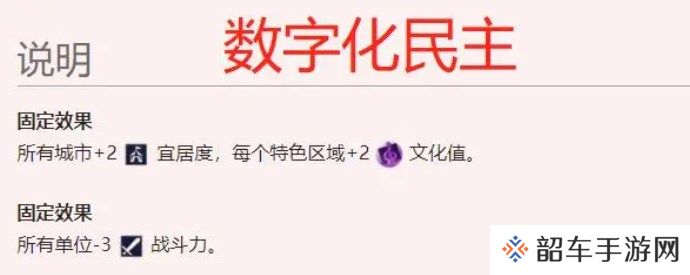 玩家可利用政体对文明进行自定义,实行相应政策来提升宜居度。如政体当中的古典共和、以及数字化**,就可以分别增加城市1点和2点的宜居度。