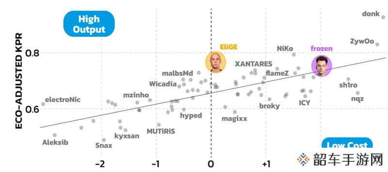 HLTV的统计模型通过追踪玩家对回合结果的影响(同时考虑对手的武器配置)显示,尽管EliGE的击杀数众多,但他对回合胜利的影响远小于frozen。