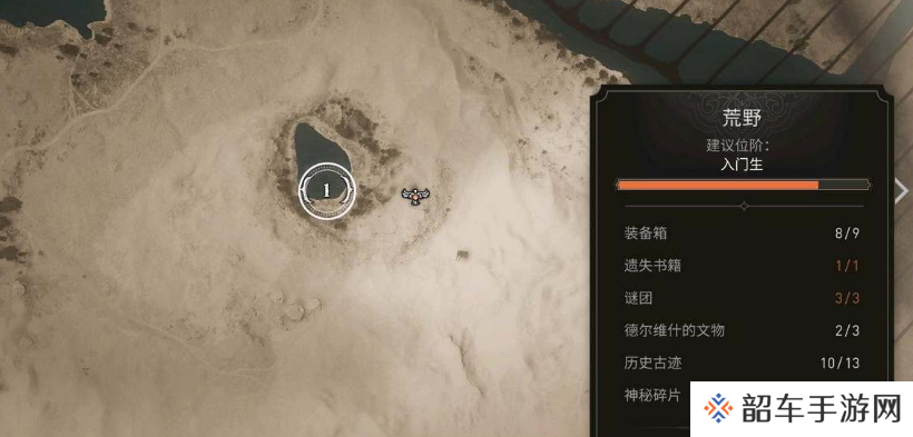 2、打开地图拖到地图荒野东北方向,在这里可以看到一个梨形的湖,任务中提到的这个隐藏的位置就在湖里面。